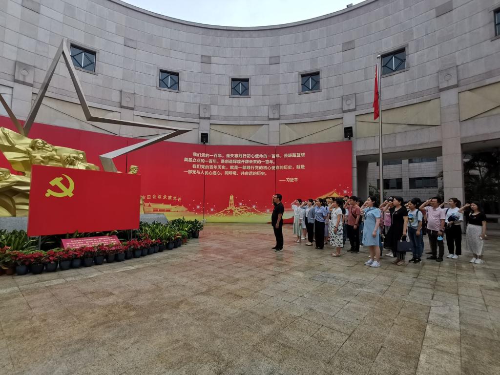 參觀結束后,全體黨員在革命紀念館雕像《奮斗》旁,面向鮮紅的黨旗莊嚴宣誓,重溫入黨誓詞,感悟入黨初心。