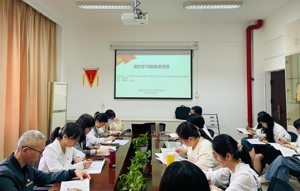 為進一步嚴明黨的組織紀律,增強黨員組織觀念,2024年6月6日,直屬馬克思主義學(xué)院黨支部黨紀學(xué)習(xí)教育讀書班在厚德樓107會議室圍繞《中國共產(chǎn)黨紀律處分條例》開展第四次集體學(xué)習(xí)活動。